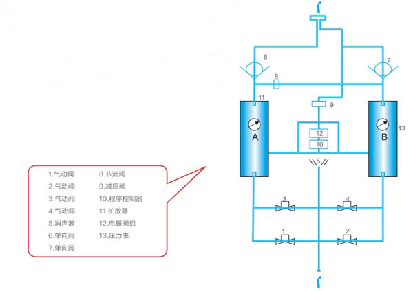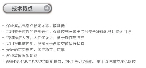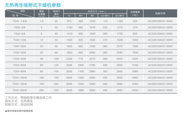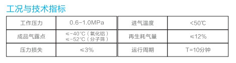 Heatless air dryer, is to use the principle of pressure swing adsorption, the drying pressure in the pipe network sorbent adsorption desorption at atmospheric pressure and brought back from the dryer outlet of approximately 12% of the dry gas to the drying adsorbent purification regeneration towers work alternately, the users point of providing air dried gas drying machine control system using the German company SIEMENS common logic controller or other importing company intelligent controller, reliable performance.