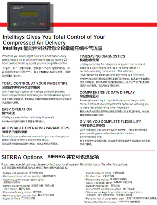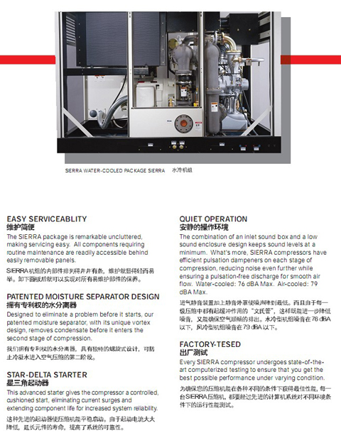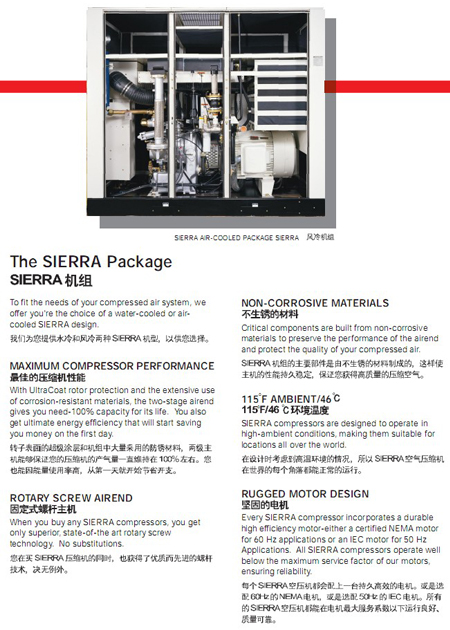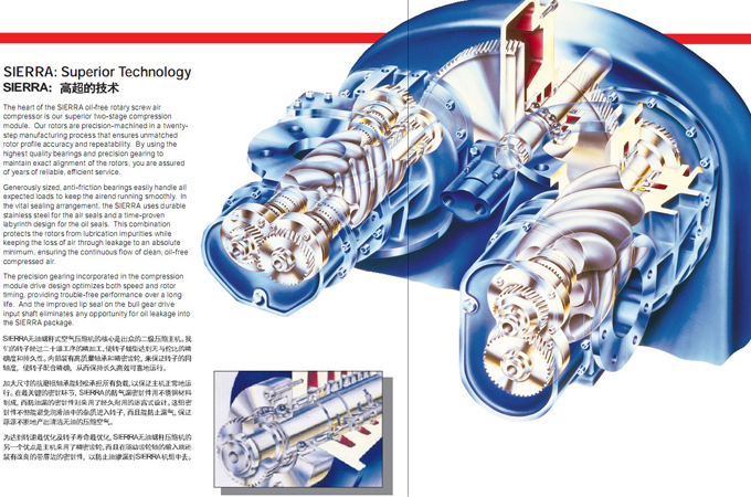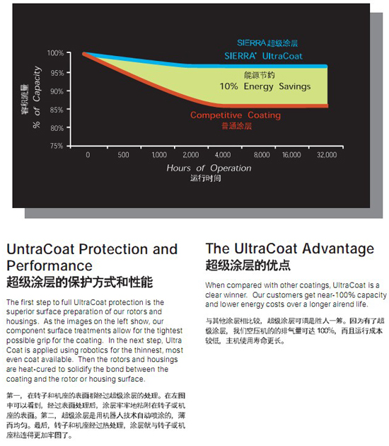 SIERRA 50-400HP无油螺杆式空压机 对我们来说,要确保我们售出的无油螺杆空气压缩机能一直保持良好的运行性能是一种挑战。经过长期的研究,英格索兰发现低劣的转子涂层运行一段时间后会脱落,转子暴露在空气中,承受空气中杂质和湿度变化的影响。最终,导致运行性能的降低,甚至对机器造成损害。