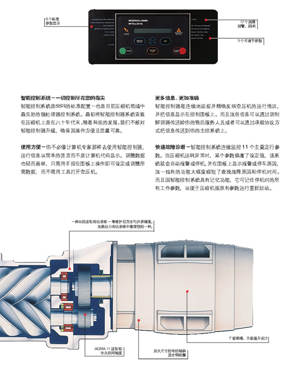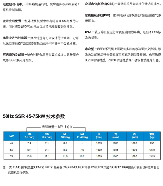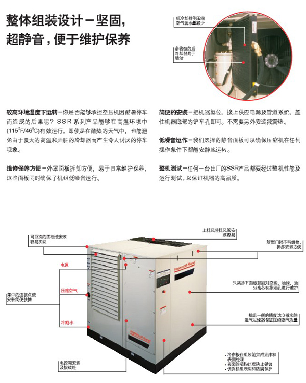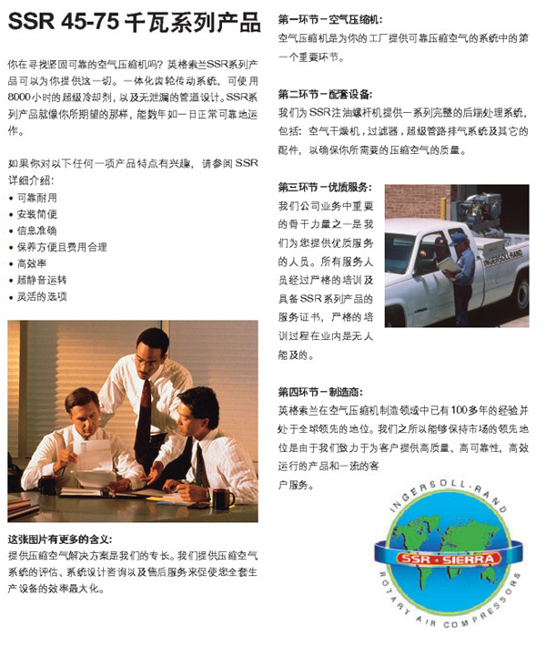 45-75KW螺杆式空压机 你在寻找坚固可靠的空气压缩机吗?英格索兰SSR系列产品可以为你提供这一切。一体化齿轮转动系统,可使用8000小时的超级冷却剂,以及无泄漏的管道设计。SSR系列产品就像你所期望的那样,能数年如一日正常可靠地运作。