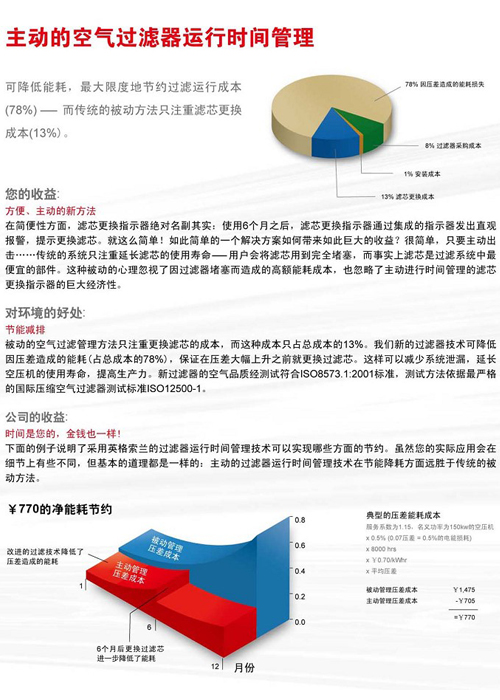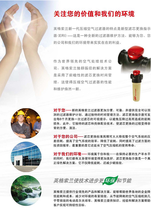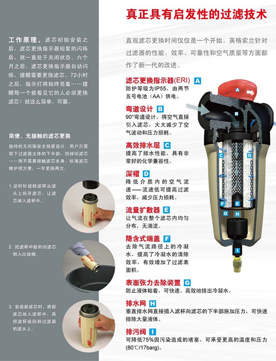 英格索兰新一代压缩空气空滤器的特点是新型滤芯更换指示器--这是一种全新的过滤器维护方法。能够为您,您的公司和我们的环境带来实实在在的利益。