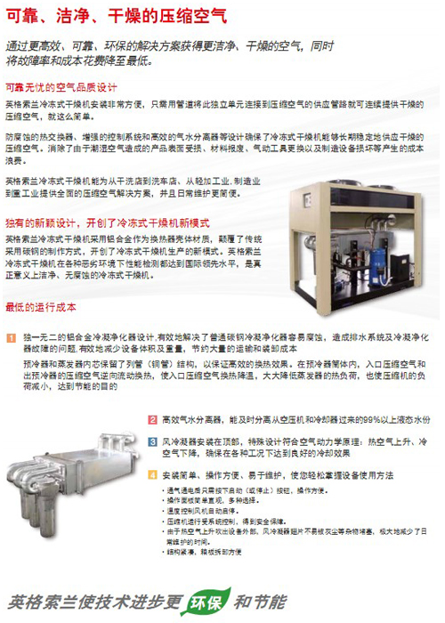 冷冻式干燥机通过更高效,可靠,环保的解决方案获得更洁净,干燥的空气,同事将故障率和成本花费降至最低。英格索兰冷冻式干燥机安装非常方便,只需用管道将此独立单元连接到压缩空气的供应管道可连续提供干燥的压缩空气,就这么简单。