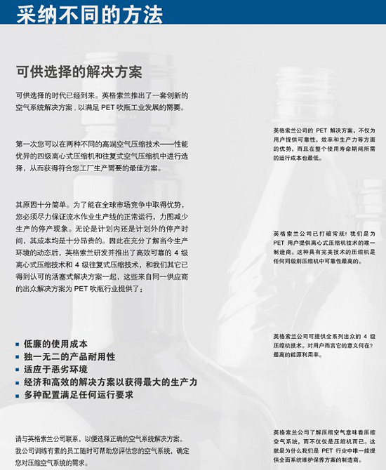 PET行业压缩空气解决方案   Intellisys智能控制器帮您全权掌握压缩空气的排气量。在一天二十四小时中,无论您需要八小时连续不断地供气,还是间断性地使用压缩空气,Intellisys智能控制器为您提供全面的控制。