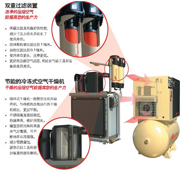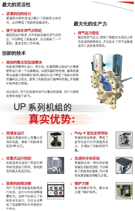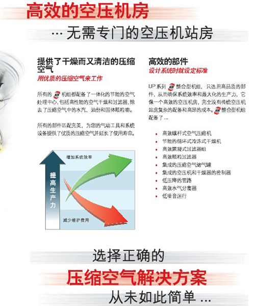 4-11KW UP series screw air compressor compact design of the internal layout of the unit area of narrow space, thus reducing the unit cost of installation.